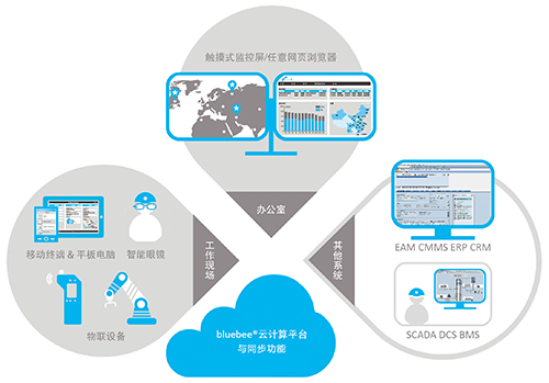 通过强大的bluebee®同步平台,不但可以对硬件设备进行远程管理,同时还能实现移动应用与后台bluebee®云计算平台,以及其他EAM/CMMS的数据同步。